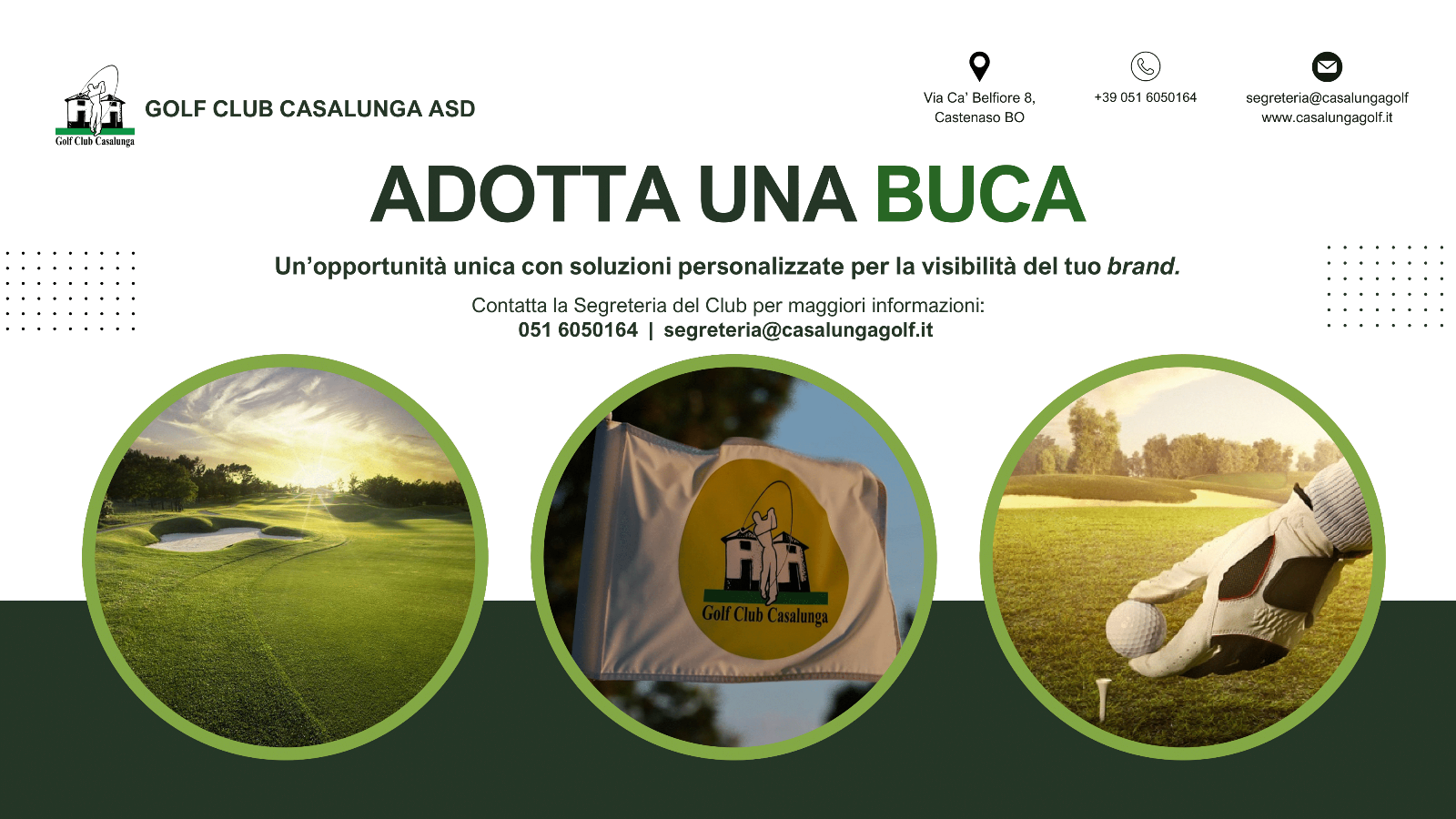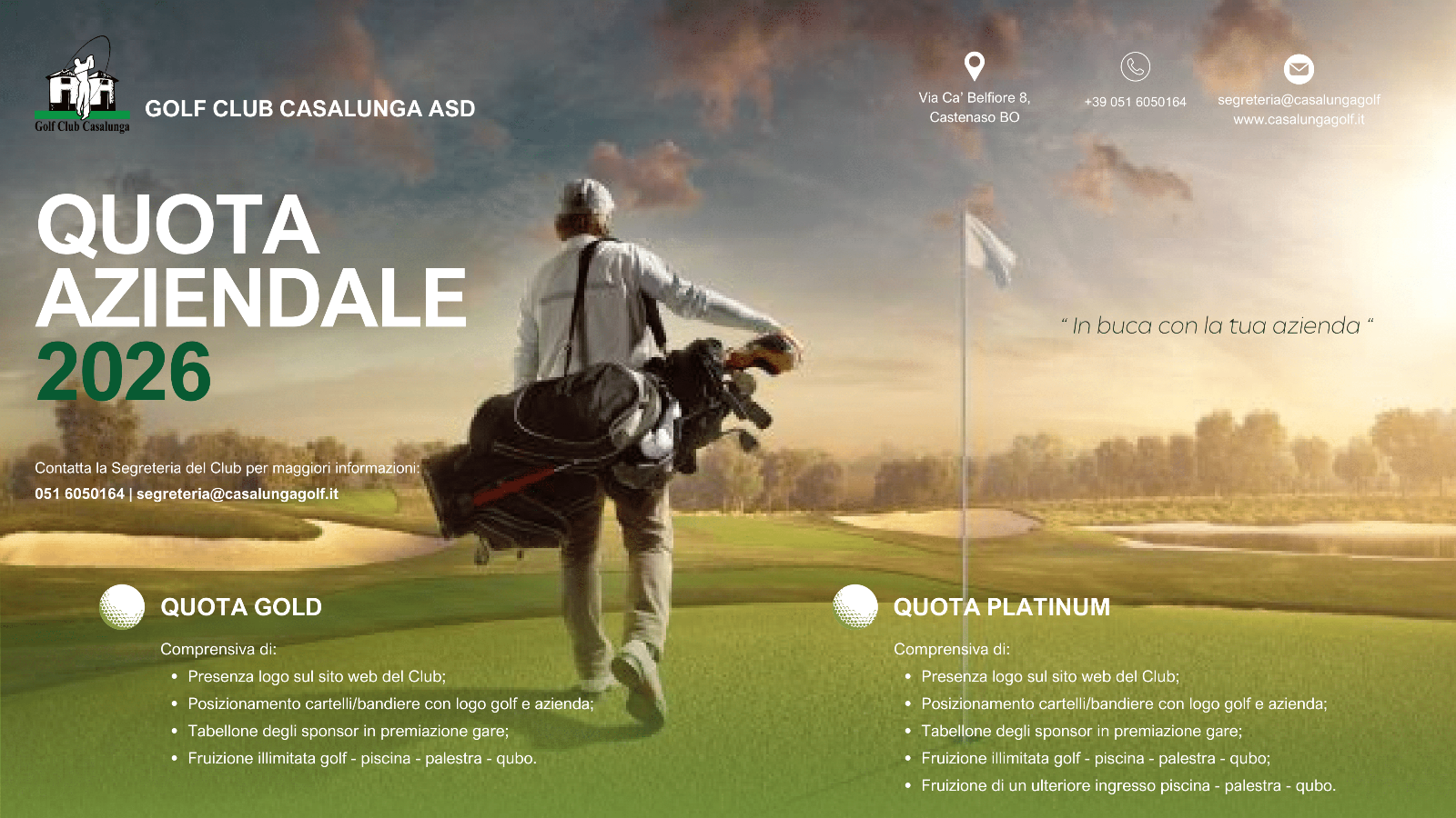 Sostieni il Casalunga Golf Club e ottieni massima visibilità: scegli tra Quota Gold e Quota Platinum e abbina il tuo brand al nostro percorso e agli eventi del Club. QUOTA GOLDComprensiva di: Presenza logo sul sito web del Club; Posizionamento cartelli/bandiere con logo golf e azienda; Tabellone degli sponsor in premiazione gare; Fruizione illimitata golf […]